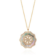 Gazing into the Sunset Pearl Pendant, this piece has an endless array of ever-changing colors. The 114 1ct average diamonds catch the sun for a brilliant shine that a necklace of this beauty deserves. Pictured here in an average of 7.8g of 18k yellow gold, our Sunset Mother of Pearl Pendant makes the perfect addition to any collection.